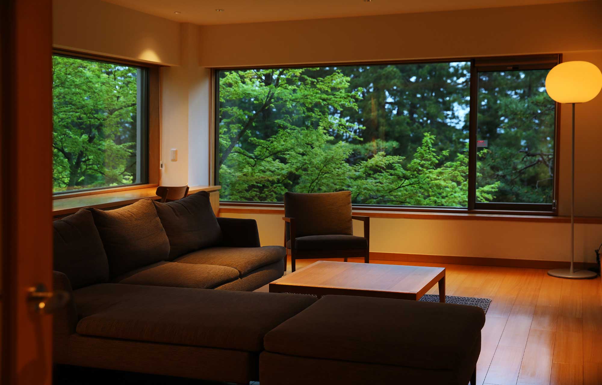 92 square meters / 3rd floor of the guestroom wing / maximum occupancy: 4 guests / scenic open-air bath / shower room / panoramic terrace room / living room / twin bedroom (Simmons) / Japanese-style room / scenic washbasin